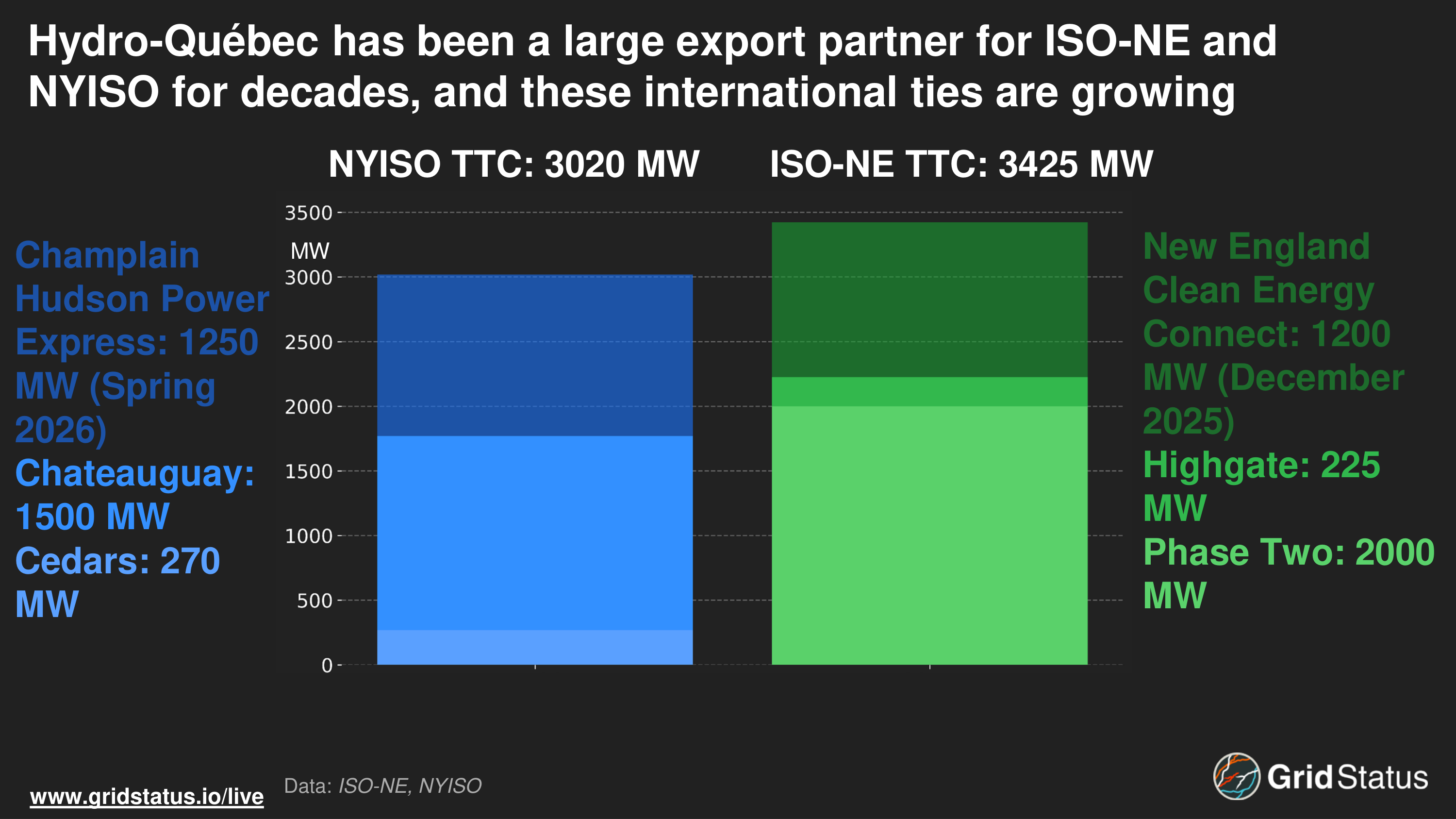 While the 80s were the first decade of expansion, the mid-2020s are expected to be another era of increased interchange capacity with the Northeast. The New England Clean Energy Connect is expected to increase ties between New England and HQ by 1200 MW by December 2025. Additionally, the Champlain Hudson Power Express (CHPE), a DC tie into New York City (Zone J), is expected to increase total TTC (Total Transfer Capability) by 1250 MW.