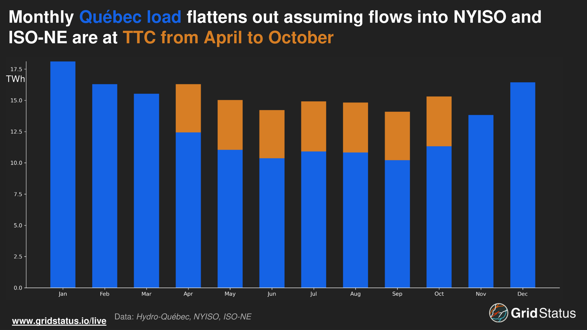Assuming that HQ was able to export into the Northeast at its new TTC (including CHPE and NECEC) from April to October, in line with NYISO’s modeling expectations, HQ’s average monthly load flattens out.