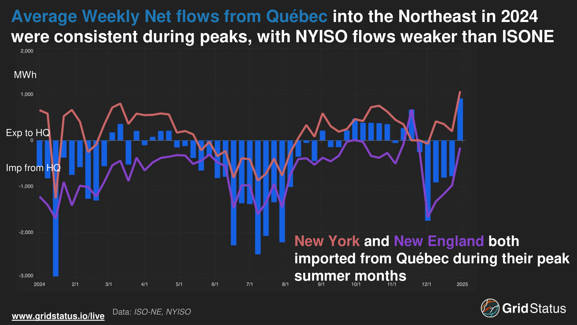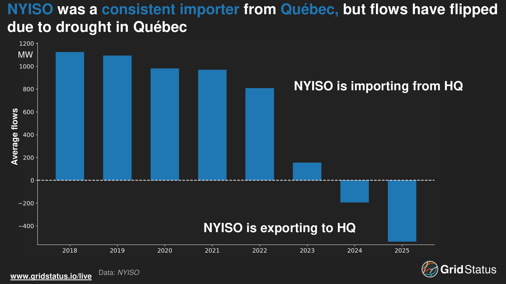 Prior to 2022, NYISO was consistently importing over 1 GW from HQ. Flows have dropped since then, with 2024 being the first year that NYISO was a net exporter to Québec.