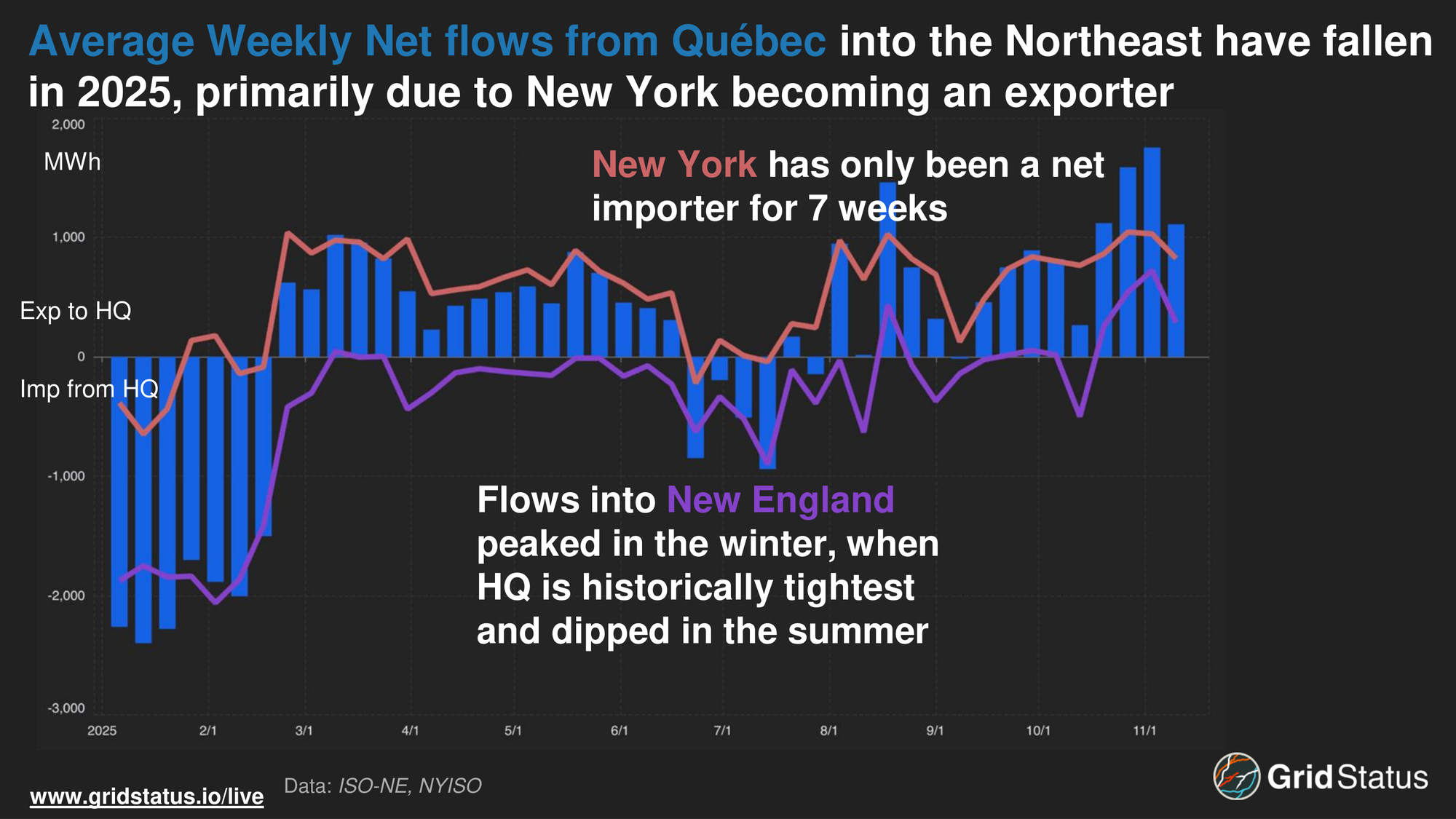 Into November, New York has been a net importer from Québec for only 7 weeks of the year. NYISO’s position as a net exporter to Québec even persisted throughout most of the summer, which has historically been NYISO’s peak and HQ’s lowest demand season. One of the only summer weeks in which NYISO was importing occurred during historically widespread eastern interconnection heat. Importantly, this was not always the case.