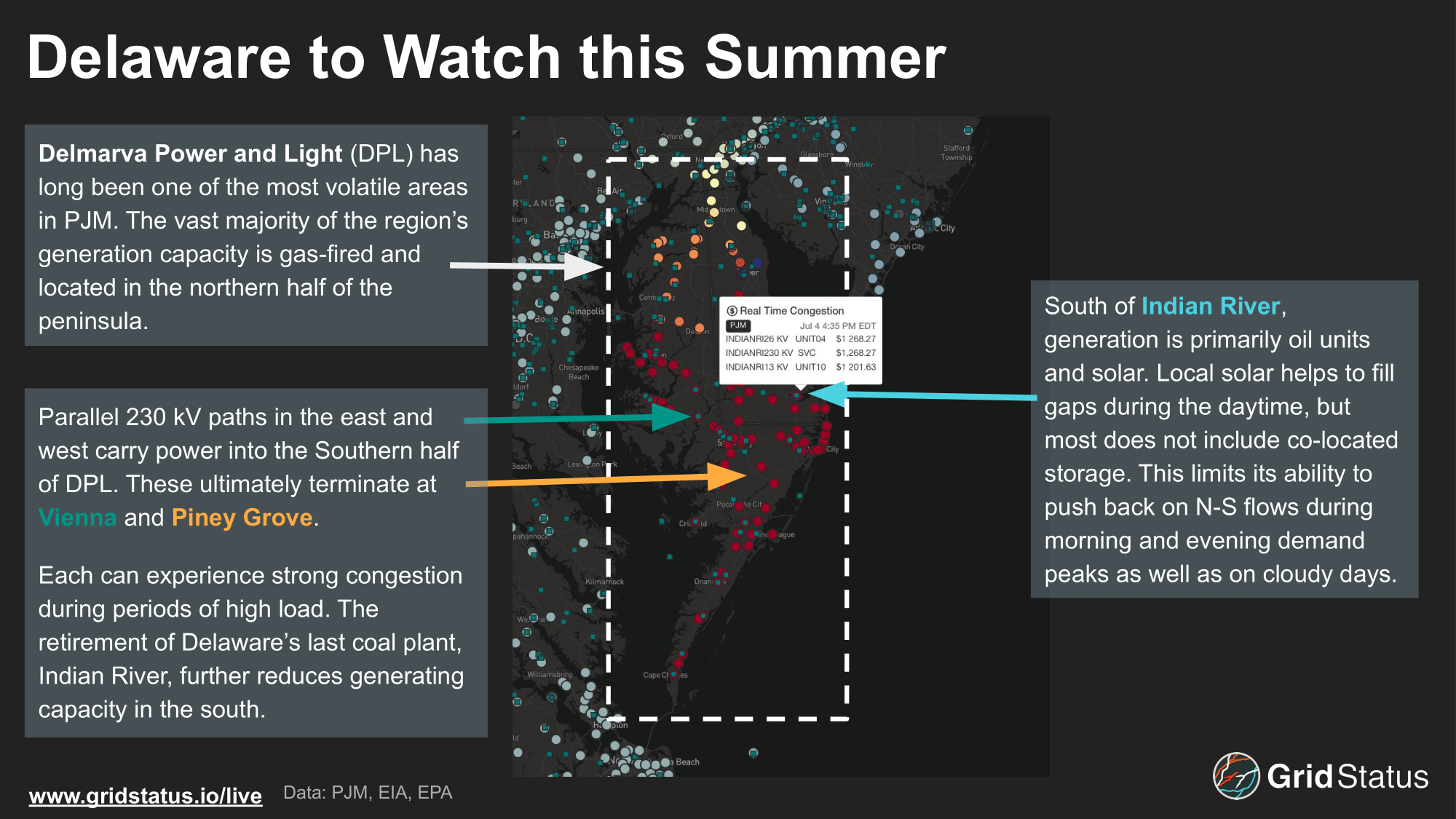 The bulk of generation in DPL is gas fired and concentrated in the Northern half of the peninsula. Only Vermont produces less electricity than Delaware, which sources ~90% of its electricity from natural gas. The state is heavily dependent on flows from neighboring states like New Jersey and Pennsylvania. Outside of its gas-fired fleet, generation is limited to solar and low capacity factor power plants such as Indian River. Limited generation south of Dover and a lack of higher voltage transmission ties to flow power in any direction except for N-S set the stage for explosive congestion during periods of high demand in the Summer and Winter.