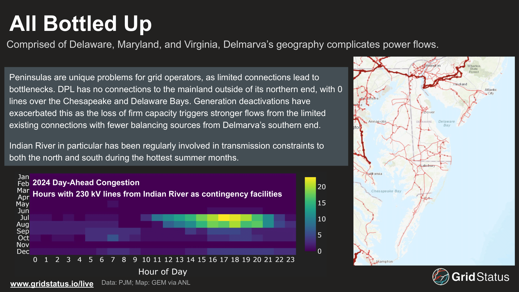 The Delmarva Peninsula's natural bottlenecks make it difficult to manage congestion during high load days. Surrounded by water on three sides, DPL has limited access to the wider grid and is heavily dependent on power flowing north to south along 230kV lines, which step down to a wider network of 138kV and 69kV lines in the Southern half of the region. The 230kV lines begin as parallel circuits, but dwindle to single lines as they move south.