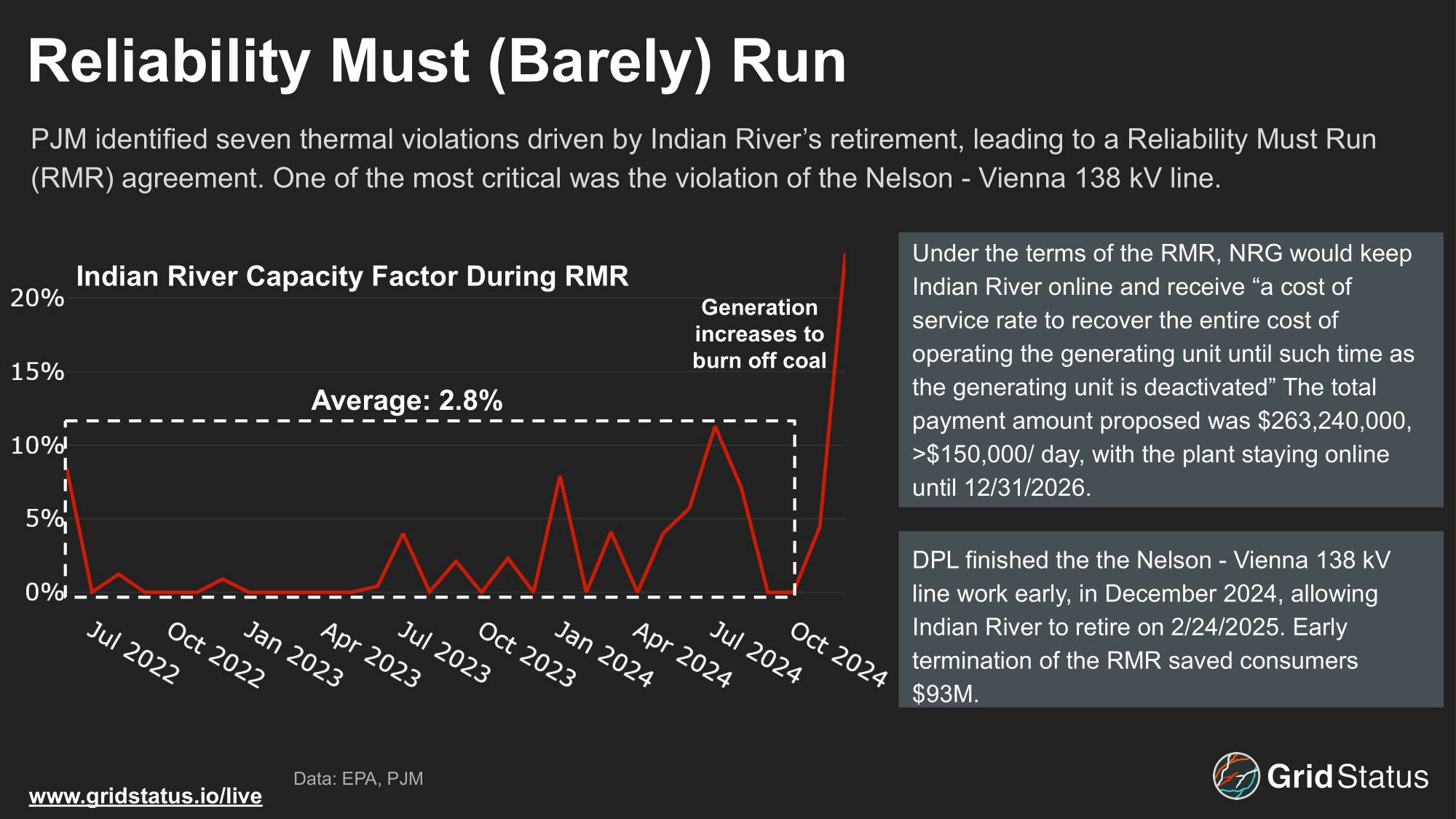 Under the RMR, Indian River would remain online until necessary transmission upgrades were completed, particularly the Nelson - Vienna line. These upgrades were completed almost two years ahead of schedule in December 2024. Following this, PJM announced that Indian River would be able to exit its RMR agreement and retire in February. This led to a notable increase in generation during December as the plant burned through its coal stockpiles ahead of its retirement.