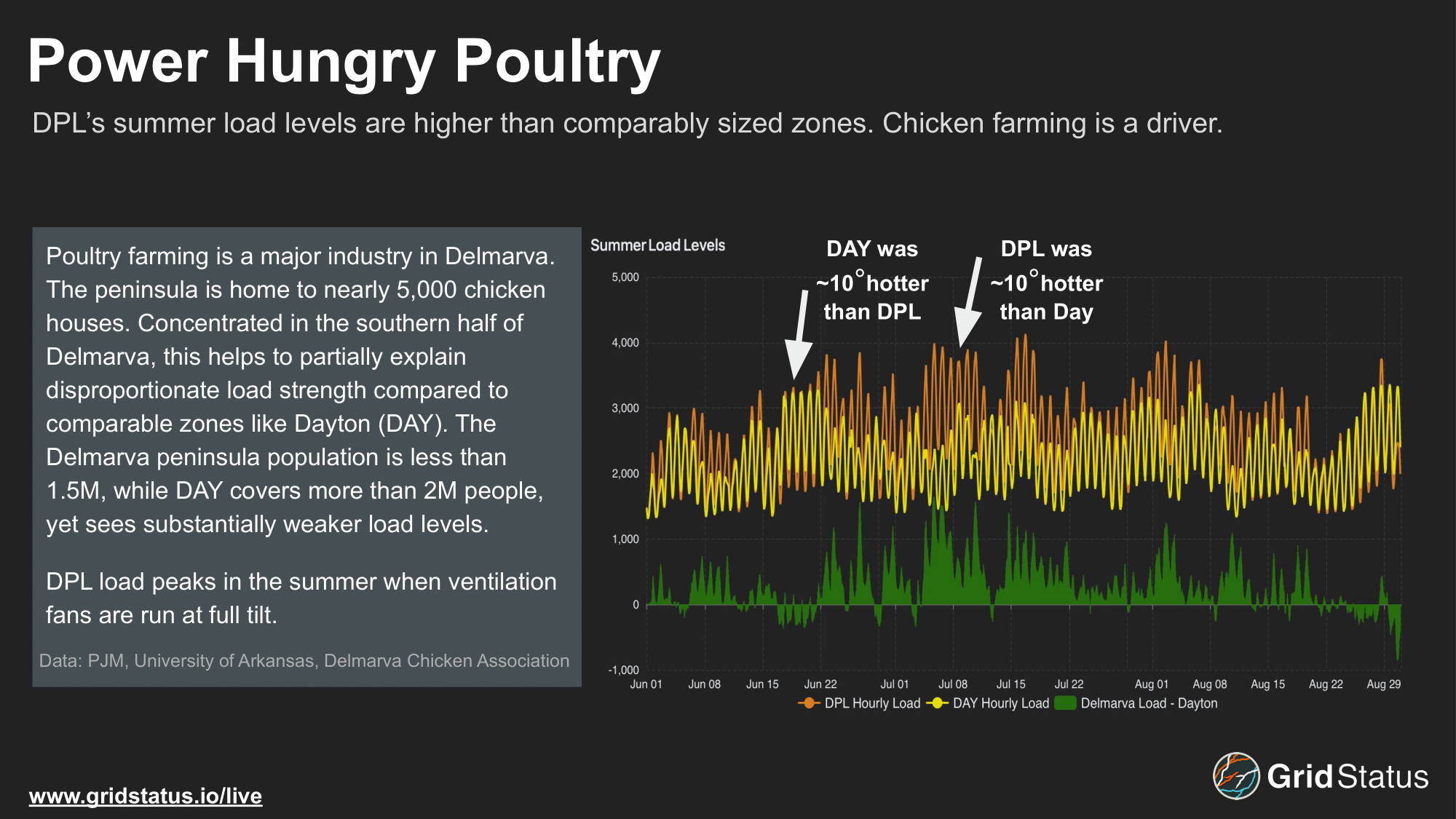 Last summer, DPL saw peaks approaching 4GW during the hottest days of July. These peaks are notably stronger than comparably sized zones like Dayton. Delaware does have some energy intensive heavy industry that may juice these peaks, but chemical manufacturing is primarily located in Northern Delaware. Venturing down the Delmarva peninsula, the landscape is dotted with clusters of boxy structures that require significant power, but unlike Northern Virginia to the west, these aren't datacenters.