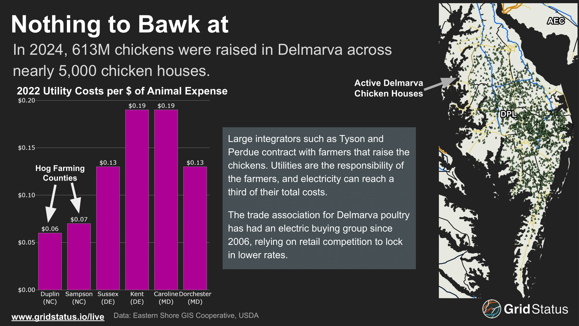 The agriculture industry in Delmarva is concentrated in the Southern half of the region, which may be a contributing factor to the level of congestion the region sees. Delmarva is home to ~5,000 chicken houses, with the highest producing county in the county, Sussex. This production can exacerbate periods of grid stress, as electricity usage at chicken houses is heavily correlated to overall coincident peak load. Poultry farms aim to limit energy expenditure by chickens which leads to higher cooling usage in the summers and heating in the winter. In comparison to the top hog farming counties in the country, chicken farming counties in the northern half of Delmarva have substantially higher utility costs per dollar of animal expense.