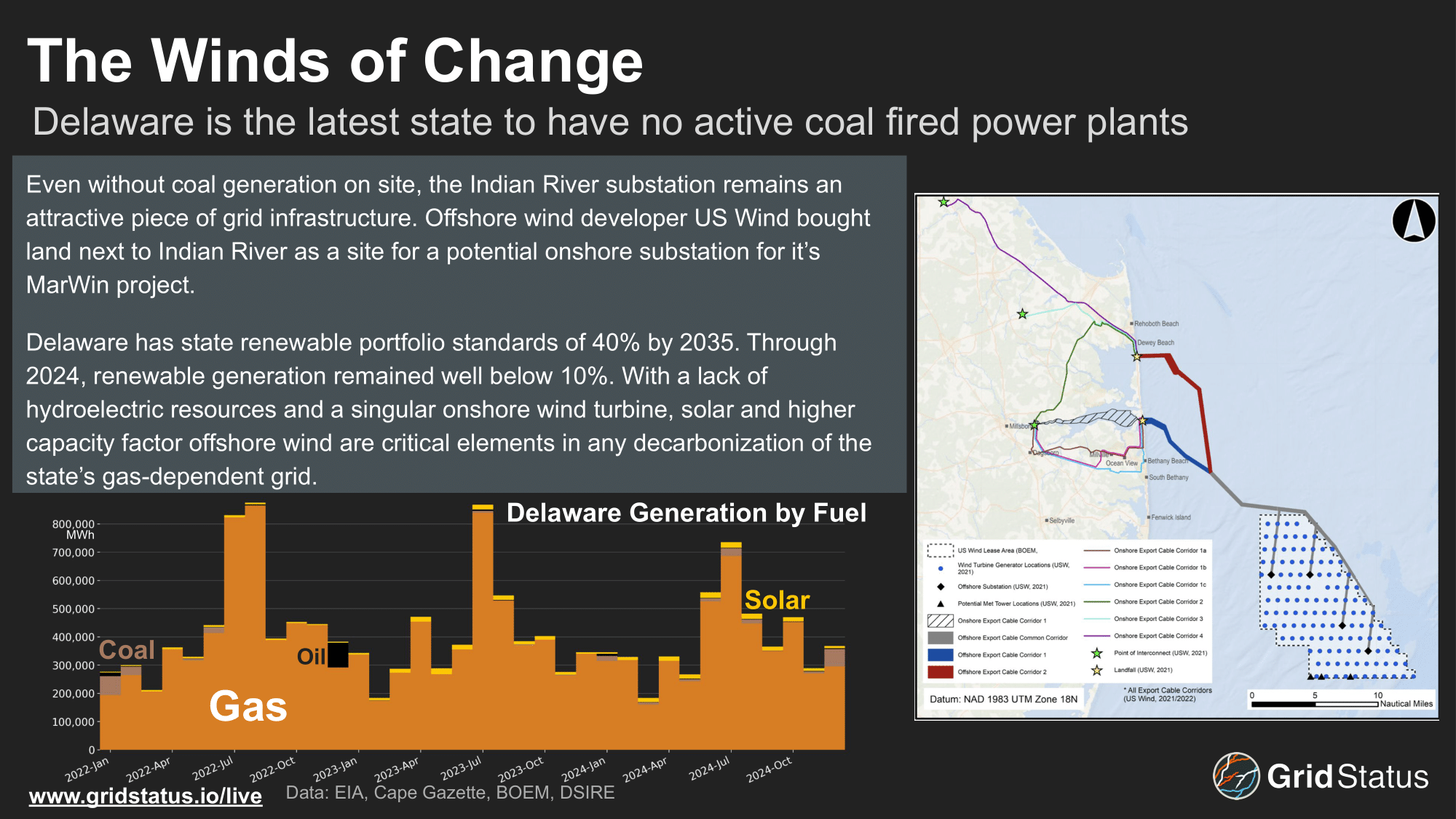 The Marwin offshore wind project anticipates tying into the Indian River substation from their own adjacent infrastructure, but has faced stiff local opposition. Headwinds extend beyond local jurisdictions, as the offshore wind industry throughout the US is facing considerable permitting and political uncertainty. Regardless of which project takes advantage of it, the Indian River substation will likely be repurposed given its favorable grid connection and easy access to offshore lease areas.