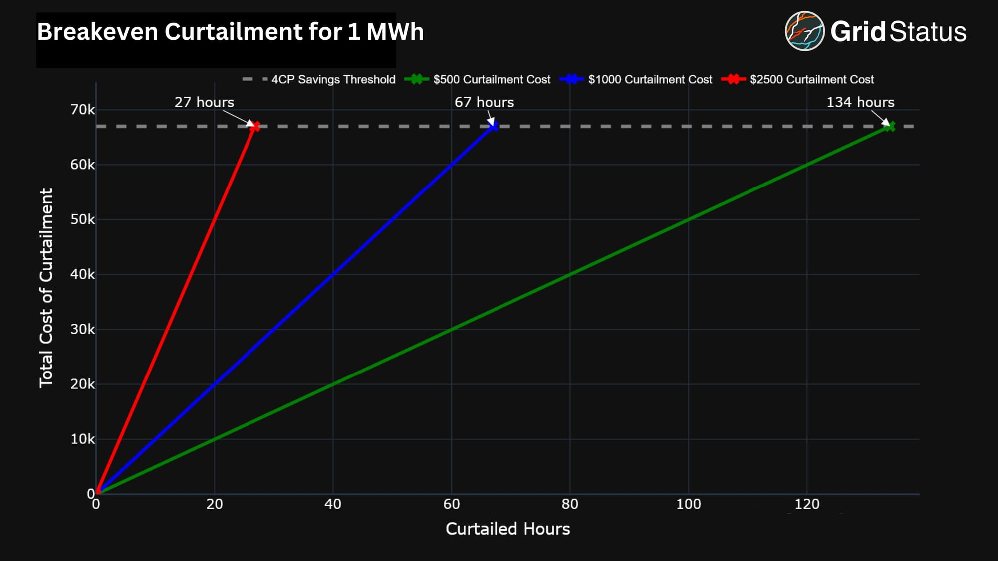 In 2023, the 4CP charge came out to around $67/kW, or $67,000/MW. Next, let’s consider the 4 coincident peaks together, i.e., 1 hour to curtail, or in this example, 1 MWh. If the cost to curtail is high, a load can only afford so many hours offline. If the cost to curtail is low, a load should curtail very often ensure they avoid the coincident peaks.