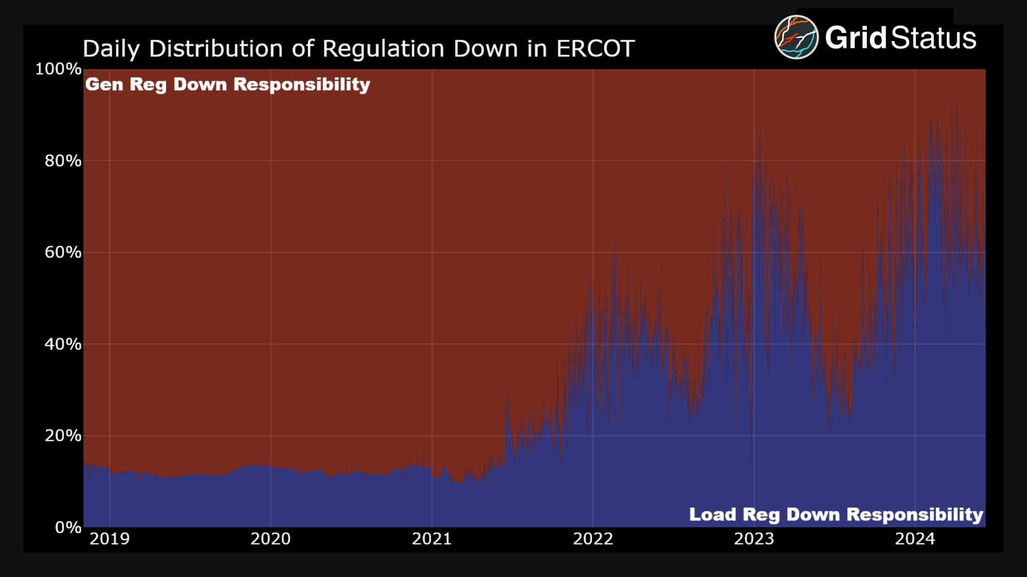 The size of each installation and the number waiting to interconnect mean they represent a surprisingly large (and growing) amount of MWs. When LFLs suspect a series of intervals may be the coincident peak, they’ll curtail. That curtailment is fast. Fast enough that ERCOT is forced to deploy the regulation down ancillary service. Let’s take a look at the breakdown of that product between generation and load resources over the last ~5 years.