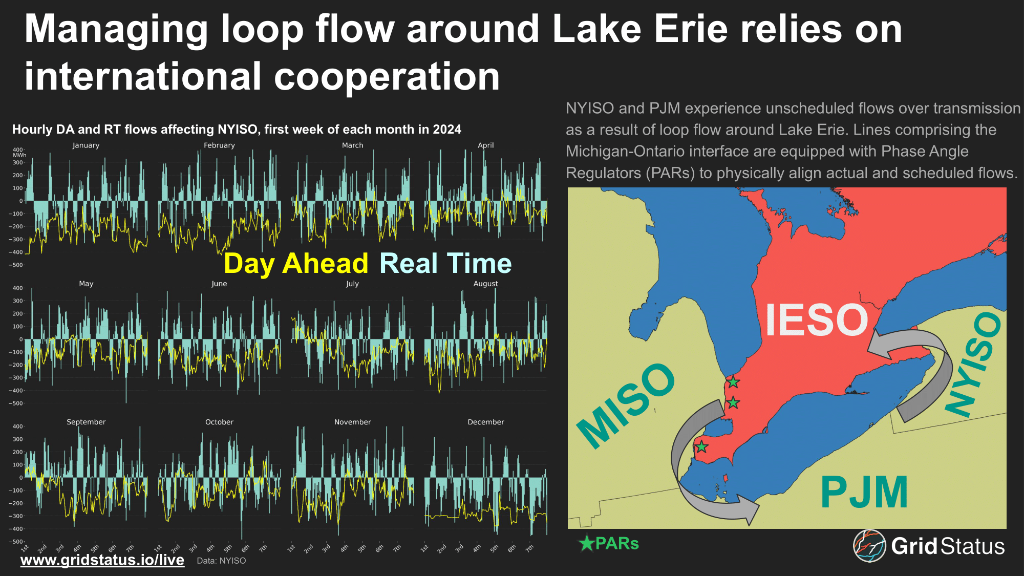 IESO plays an important role in managing the flow of power around Lake Erie, which affects both NYISO and PJM as a result of operations at their border with MISO. As a general rule, power flows along the path of least resistance, and that topology doesn’t respect administrative boundaries on its own. Power flows circulate around Lake Erie, flowing between Ontario, through Michigan, through Ohio and Pennsylvania in PJM, then into New York and back into Ontario.