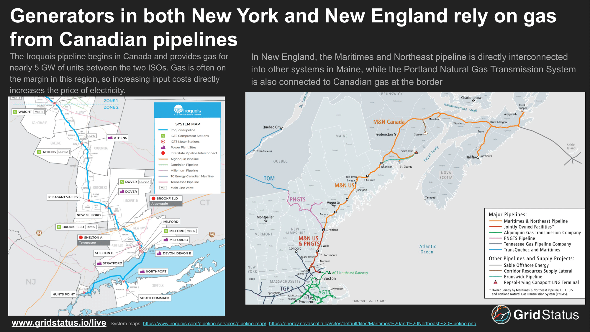 Gas is often the marginal unit in both markets, meaning an increase in input costs puts upwards pressure on system energy prices. For example, Cricket Valley in New York sources gas from Iroquois.