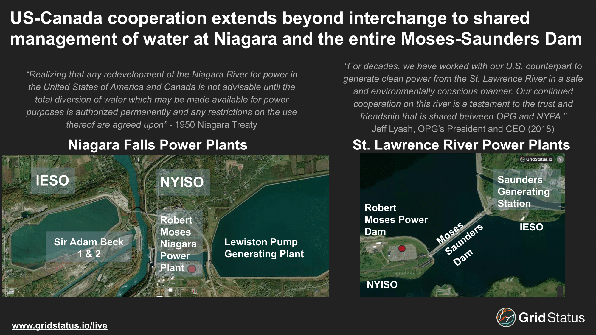 Power market cooperation between the United States and Canada is not only limited to tie flows. The two countries share a long history of collaboration and management along the St Lawrence River and at Niagara Falls. Both utilize the vast hydro potential of the Niagara region, and under the 1950 Niagara Treaty, the nations collaboratively manage the flow of water to balance power generation and the iconic experience of Niagara Falls itself.
