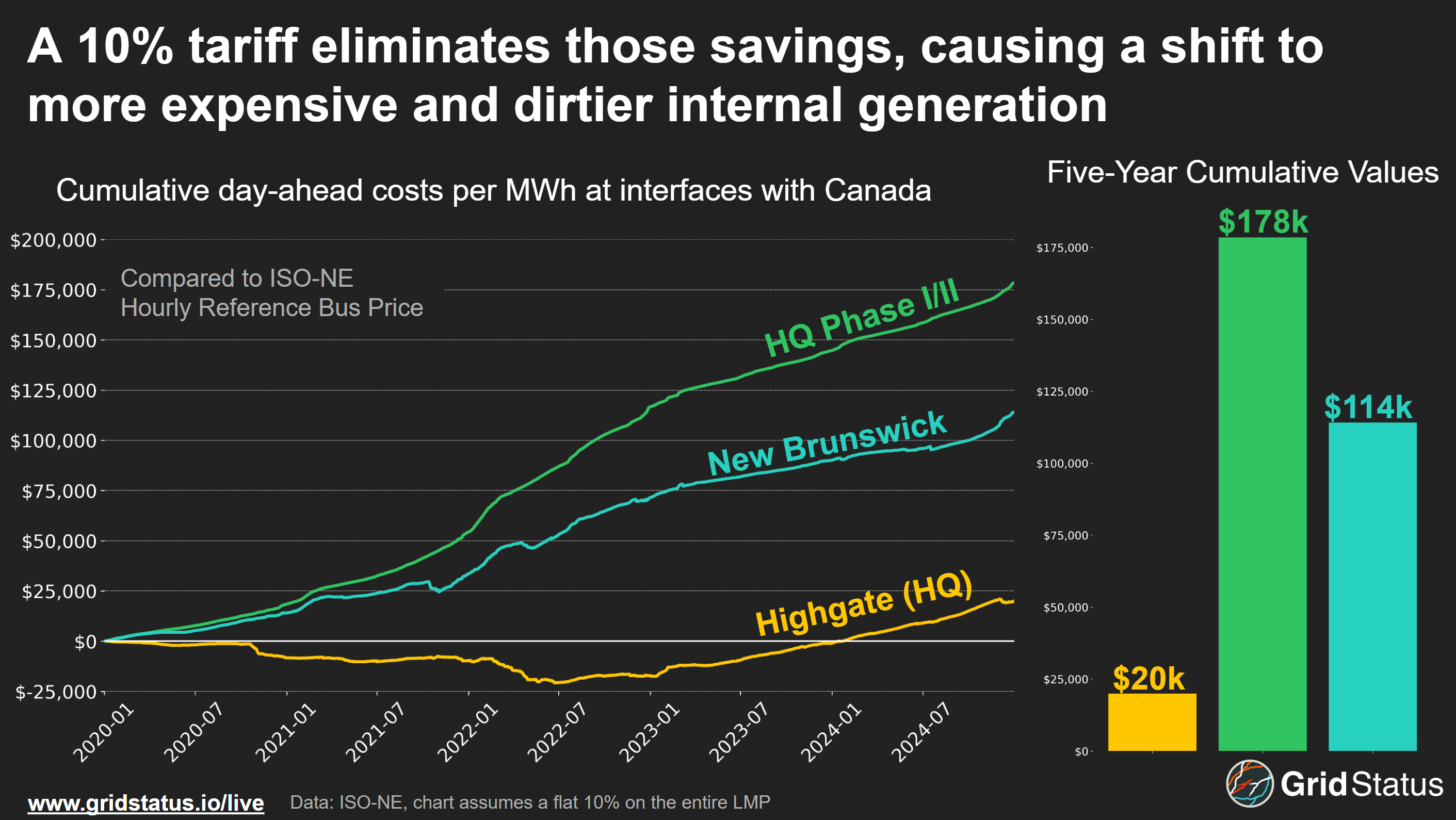 Just a 10% tariff eliminates that value. Now, Canadian hydropower would often be more expensive than generation in New England, with all three locations shifting to costs as opposed to savings by the end of the five year period.
