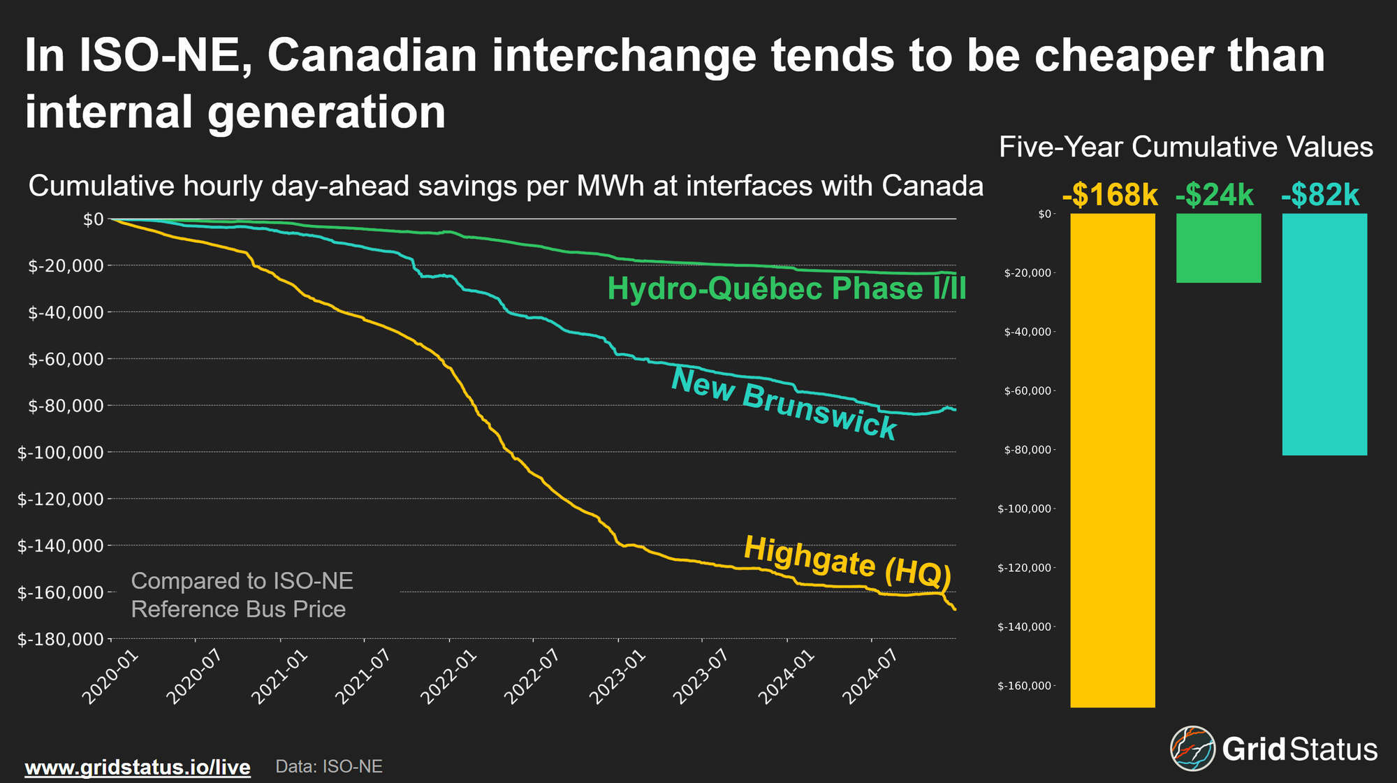 Over the last 5 years, the day-ahead prices at each point of international interchange for ISO-NE have been cheaper than the system's reference bus. Total cost savings from actual flows are much higher, but this representation shows the possible savings associated with the persistent basis between reference and imports.