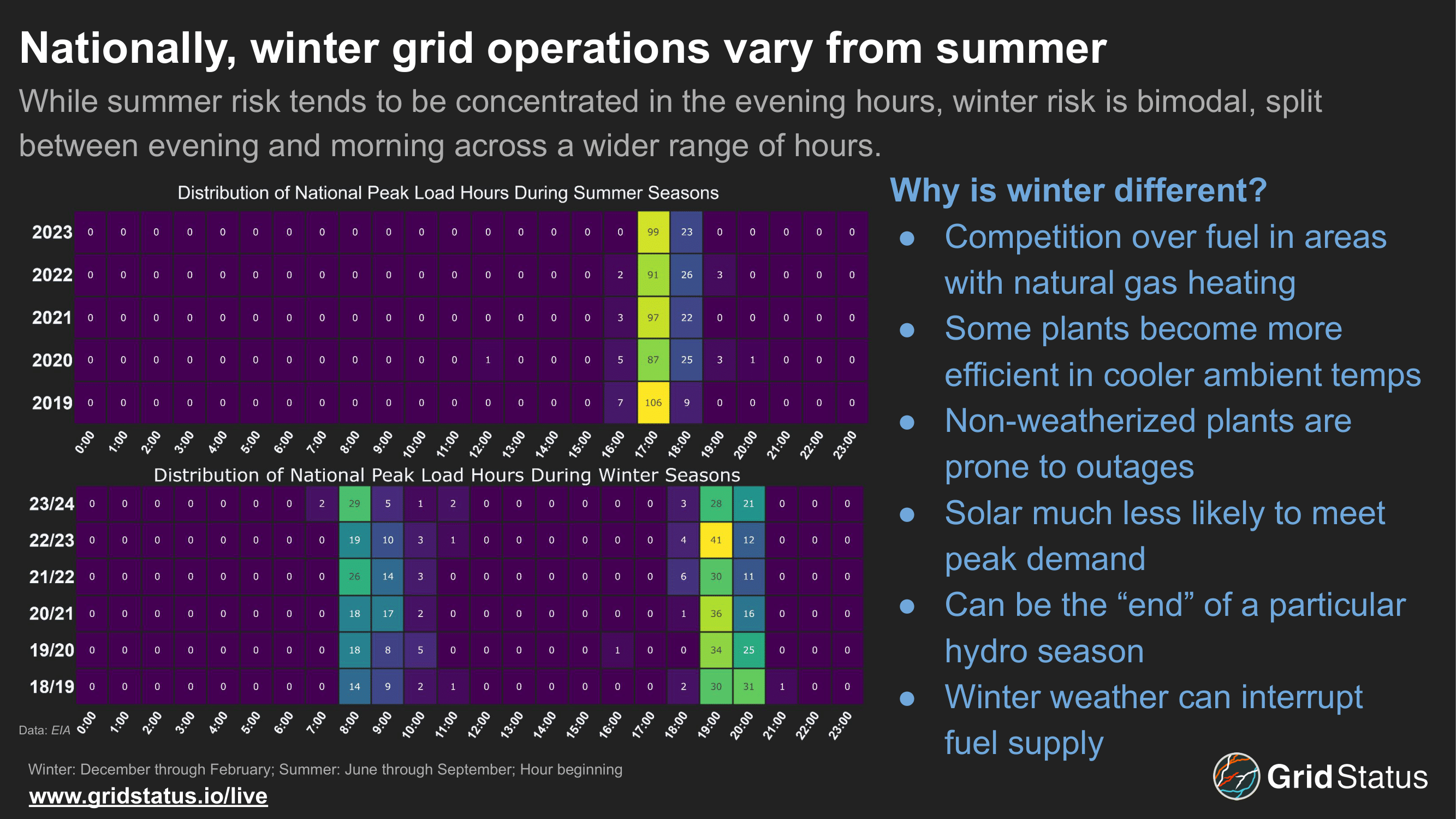 Summer risk is concentrated in the evening, before the sun sets, but when cooling load is distributed across a wider array of locations: commercial spaces, offices, residential, and more. Traditionally, grid planning in the United States has centered around summer demand peaks and their associated risks as they were generally also the annual peak.