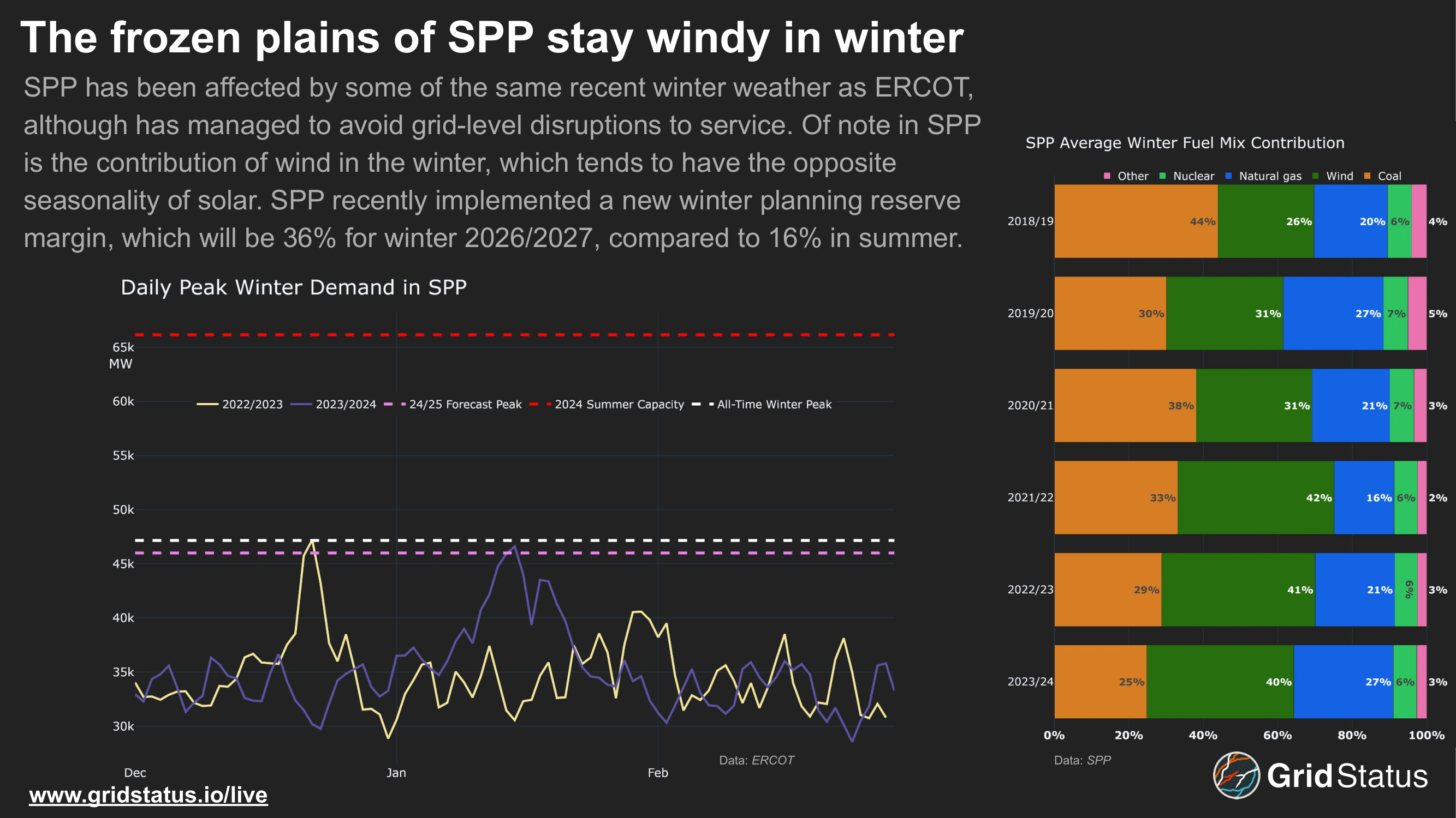Over the last 6 years, coal's share of winter generation in SPP has declined while wind's has risen. Like ERCOT, seasonal peaks have occurred in recent years, while the current capacity outlook provides plenty of headroom. However, concerns do exist with respect to winter resource adequacy. This manifested in recent changes to SPP's requirements, including the implementation of a winter planning reserve margin (PRM).