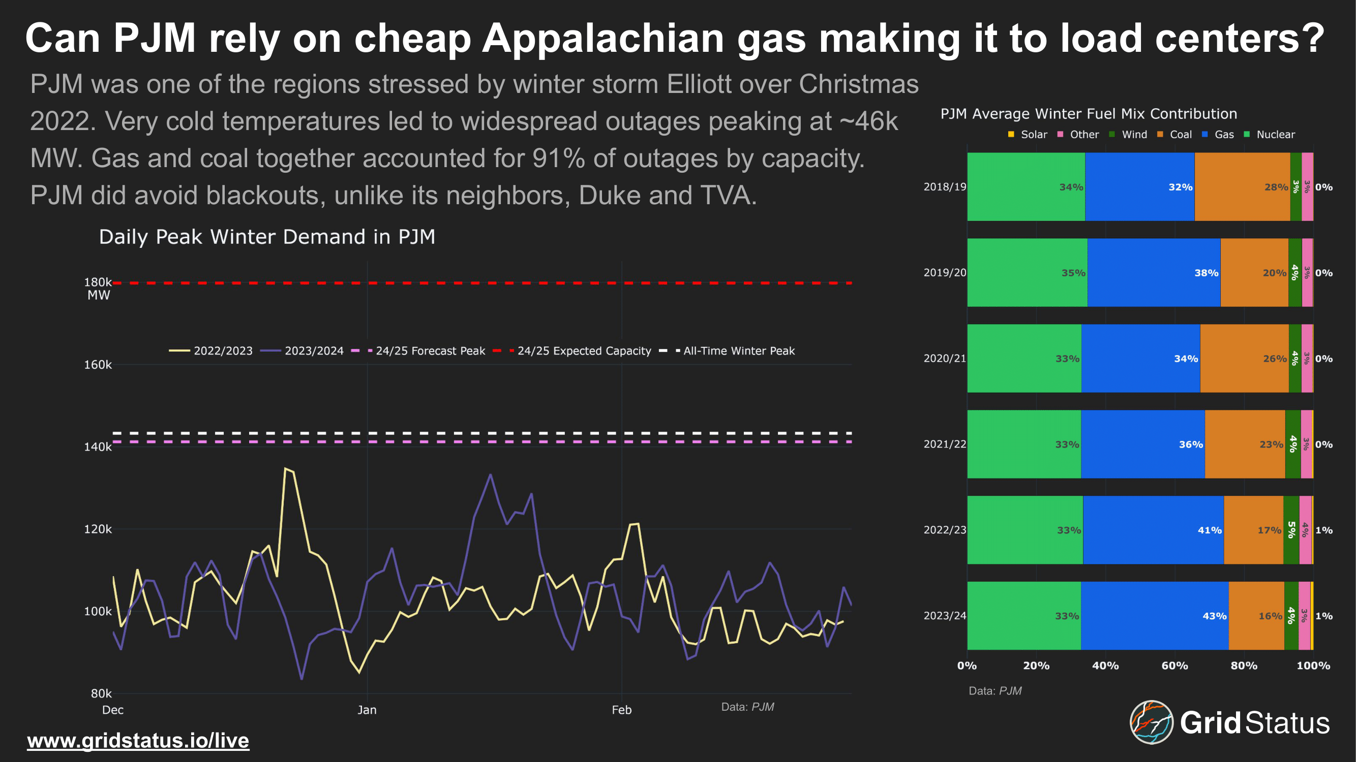 Winter storm Elliott was a particularly challenging setup for this mix, with most adjacent control areas struggling to serve demand while gas infrastructure also faltered. While TVA set a winter demand record (which was surpassed on January 17th, 2024) PJM peak demand did not crack its winter top ten list, and neither Duke Energy Carolinas or Progress set their own records. Despite this, both Duke and TVA were forced to shed load and PJM saw an average shortfall of more than 38GW in terms of resource performance over the event, but managed to avoid load shed itself.