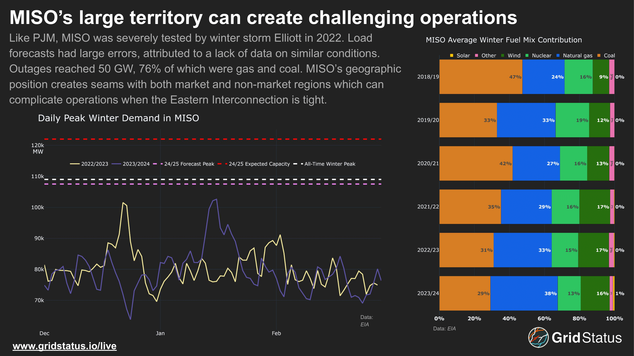 MISO's winter resource mix trajectory has been a combination of SPP and PJM, with both wind and gas generation rising and taking share from coal. Like PJM, MISO's peak demand days remain in the past, although load growth is also expected to change this over the coming years.