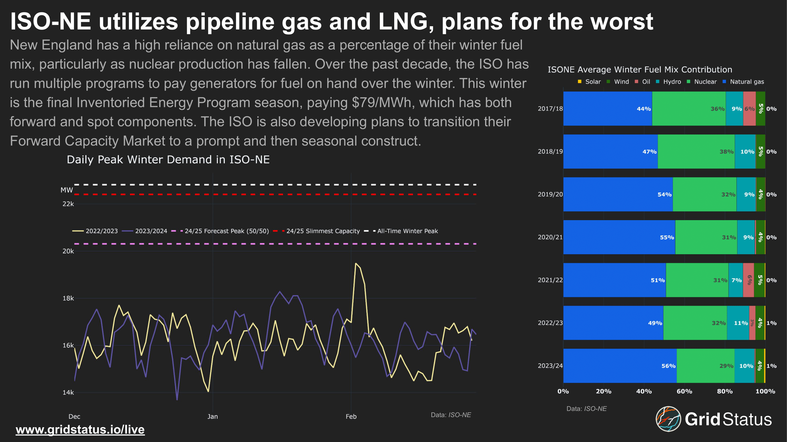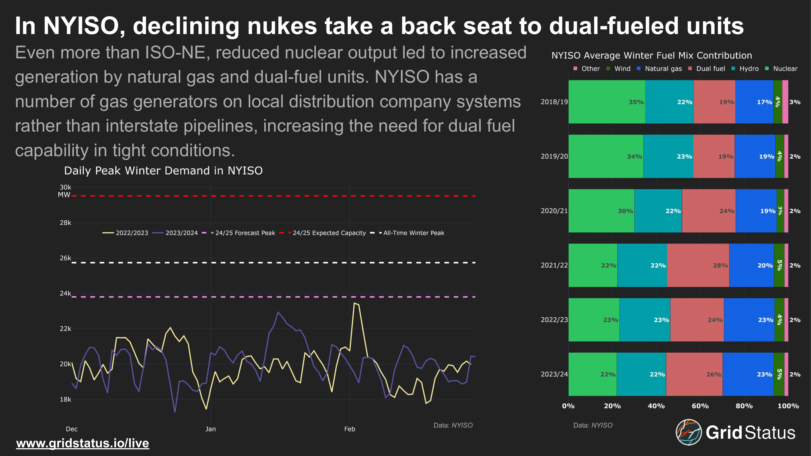 Last on our list (CAISO mostly experiences what the rest of the country knows as "winter" in ski towns) we have NYISO. Like ISO-NE, a reduction of nuclear capacity gave gas room to expand, but in this case throughout the day as New York has a smaller behind-the-meter capacity. NYISO does, however, also have the highest penetration of hydropower in the eastern interconnection. Completed maintenance at Niagara and transmission upgrades have enabled some additional generation as flows face less impedance when seeking demand in the opposite corner of the state.