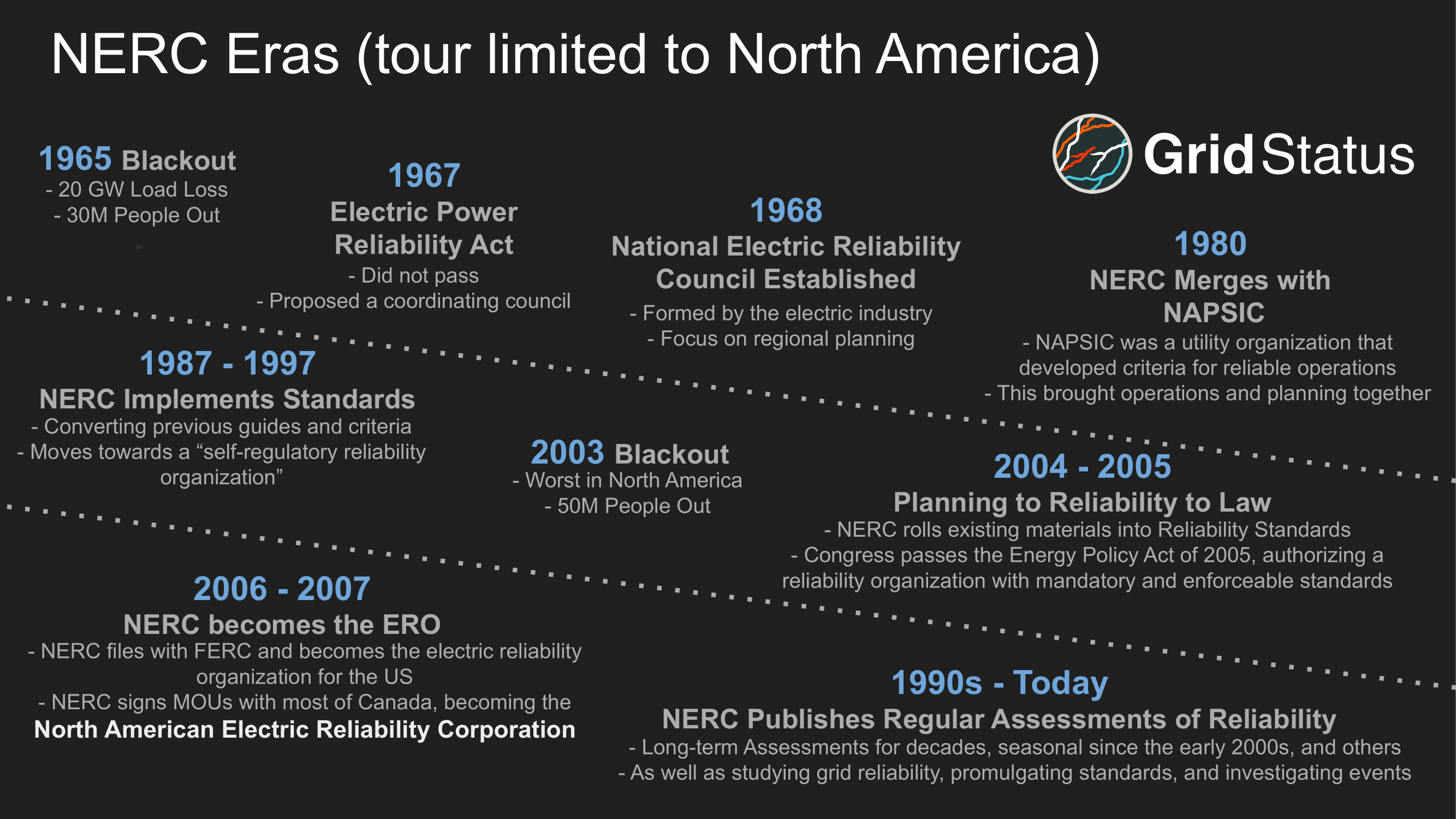 NERC has been a fixture in US and North American energy systems planning for decades. Reliability during extreme weather events, safe integration of inverter-based resources, and general risk assessments have been key focuses of the organization in recent years, but it didn't always have the authority to promulgate standards. Hopefully the more proactive NERC of the 21st century can help us avoid repeats of past events which precipitated the expansion of its remit.