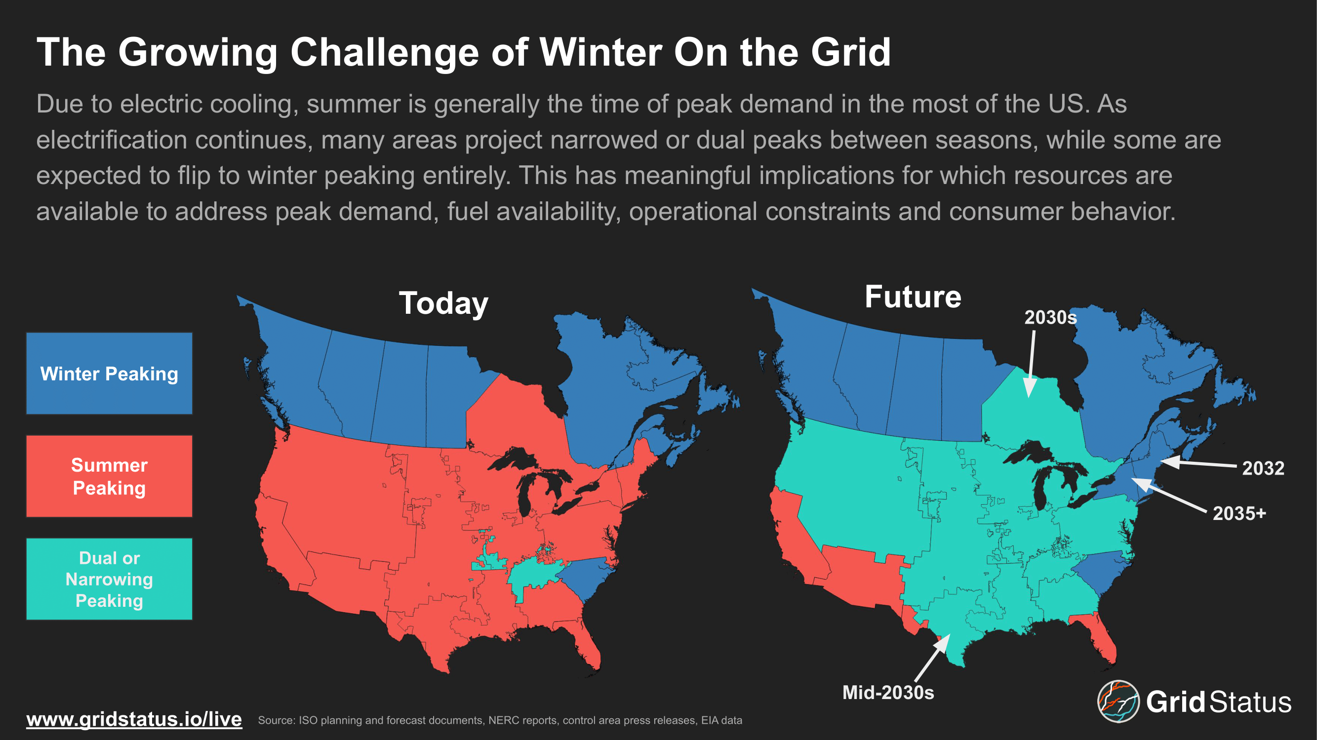 By the mid-2030s, many more regions of the US are expected to have narrowed the summer-winter gap, moved to dual seasonal peaks, or flipped entirely. NYISO and ISO-NE have predicted a flip towards winter peaking for years due to electrification, although as the rate of home upgrades has proved unpredictable estimates have been shifted further out.