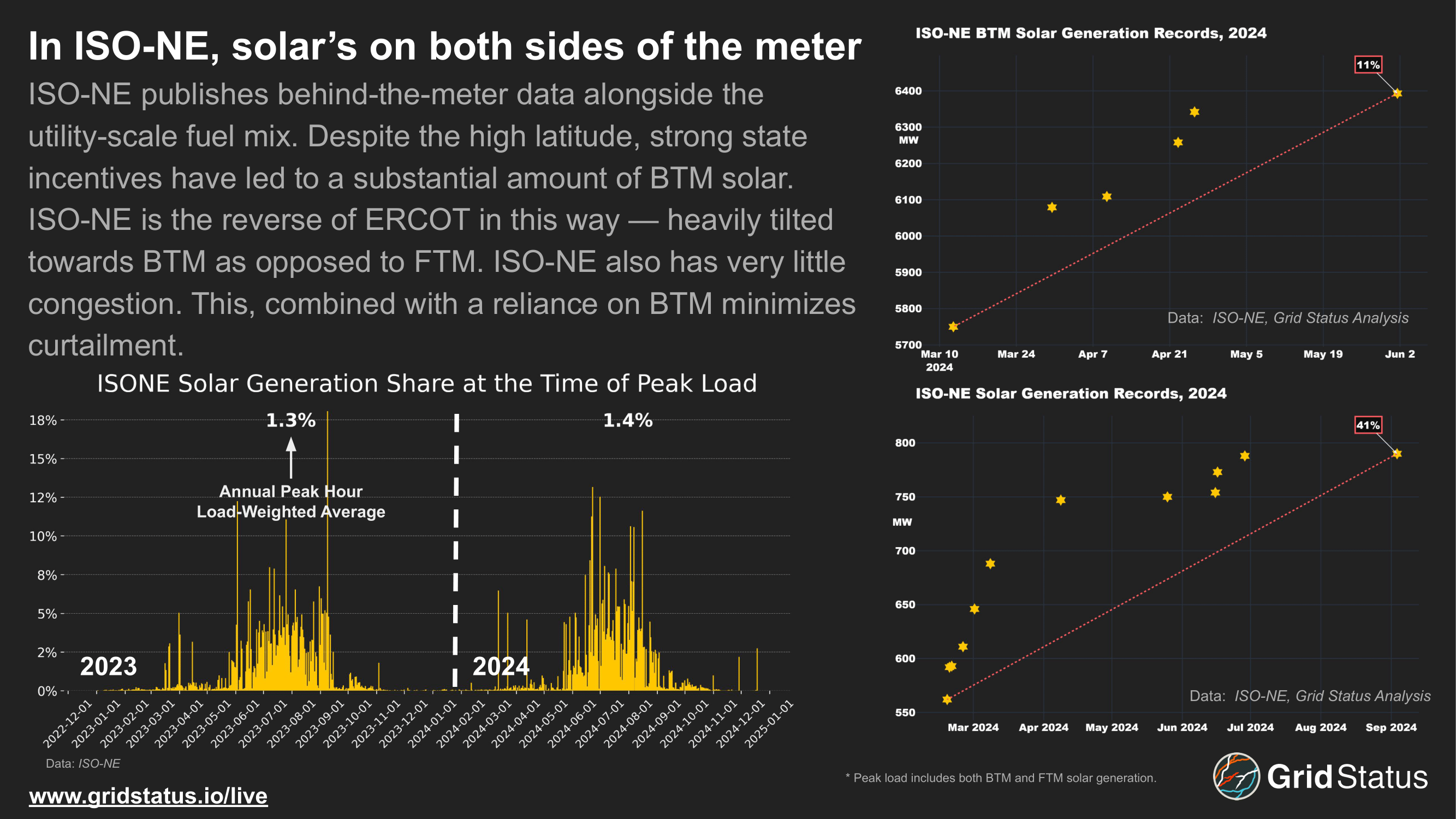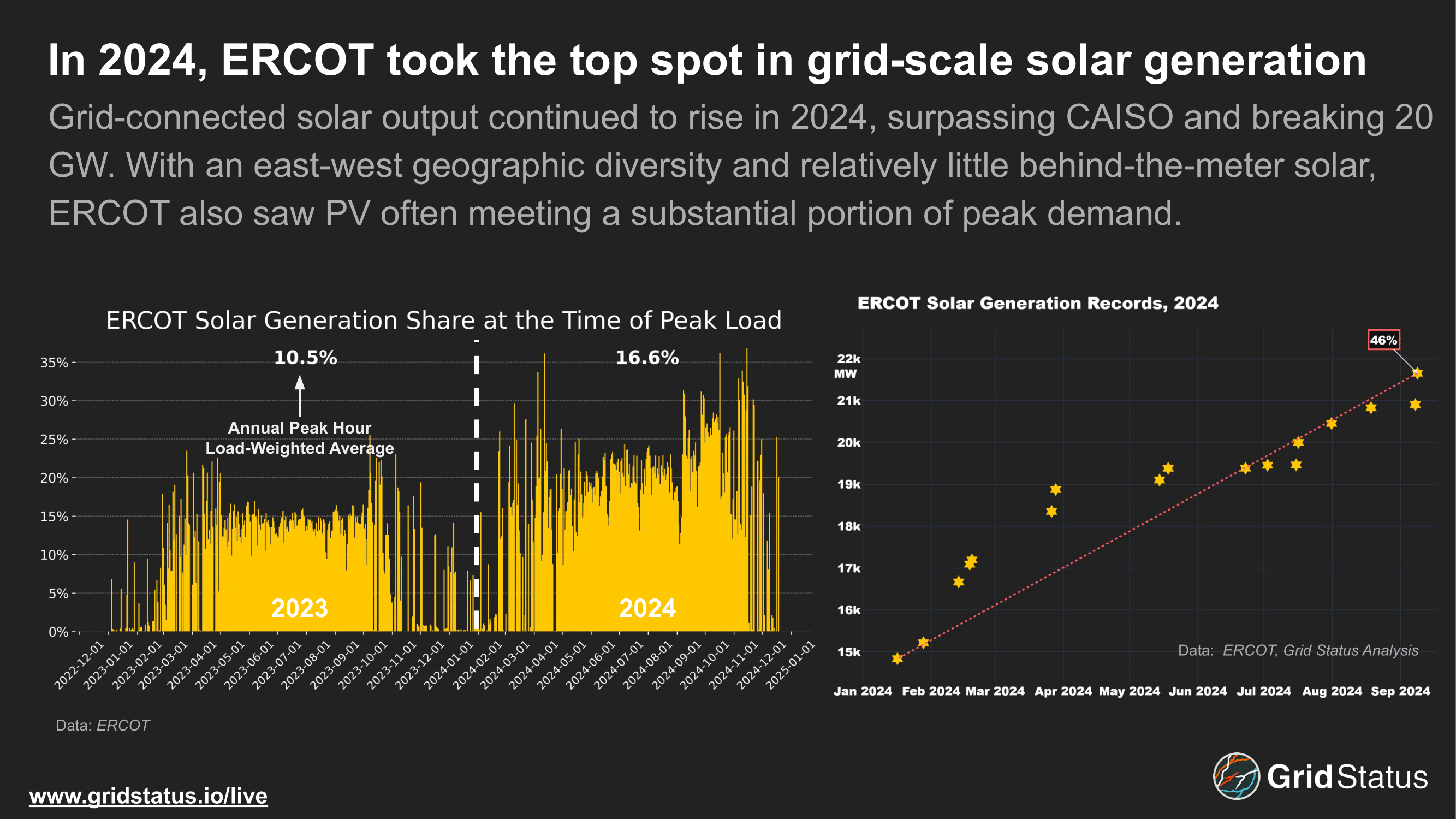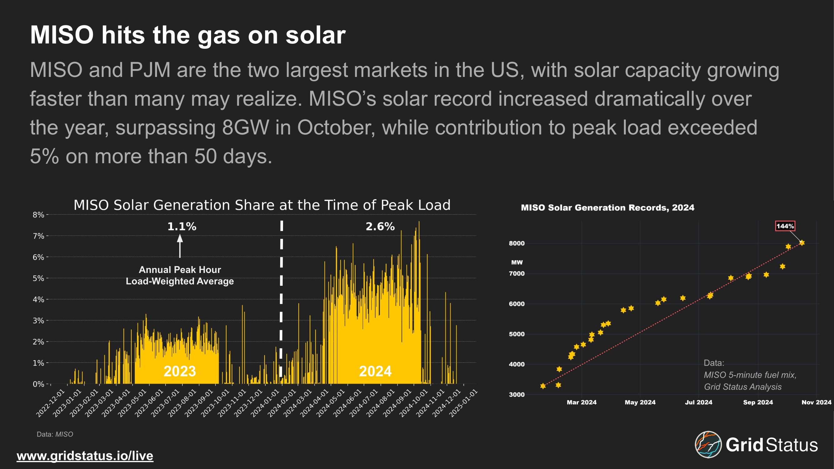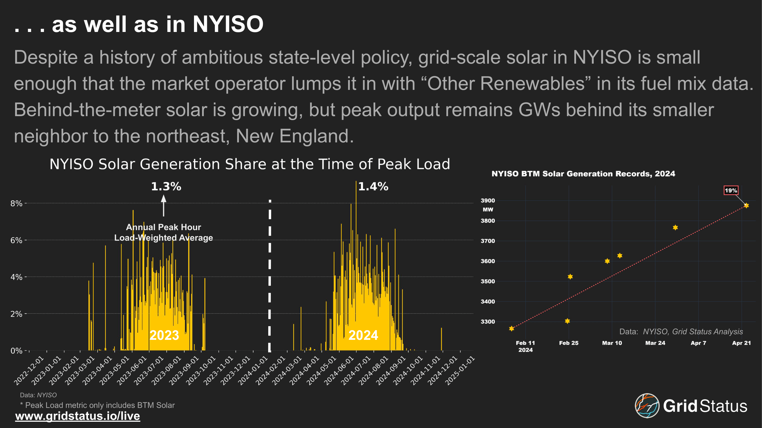 In 2024, solar deployment continued to grow, and began to expand significantly into markets beyond CAISO and ERCOT, the current leaders. We took a look past installed capacity to see how much solar is contributing to peak load - traditionally a high-risk time on the grid.
