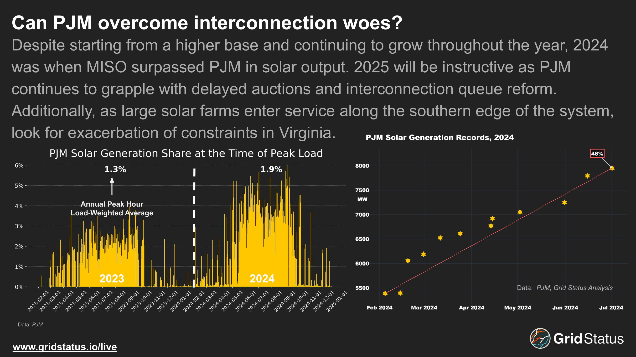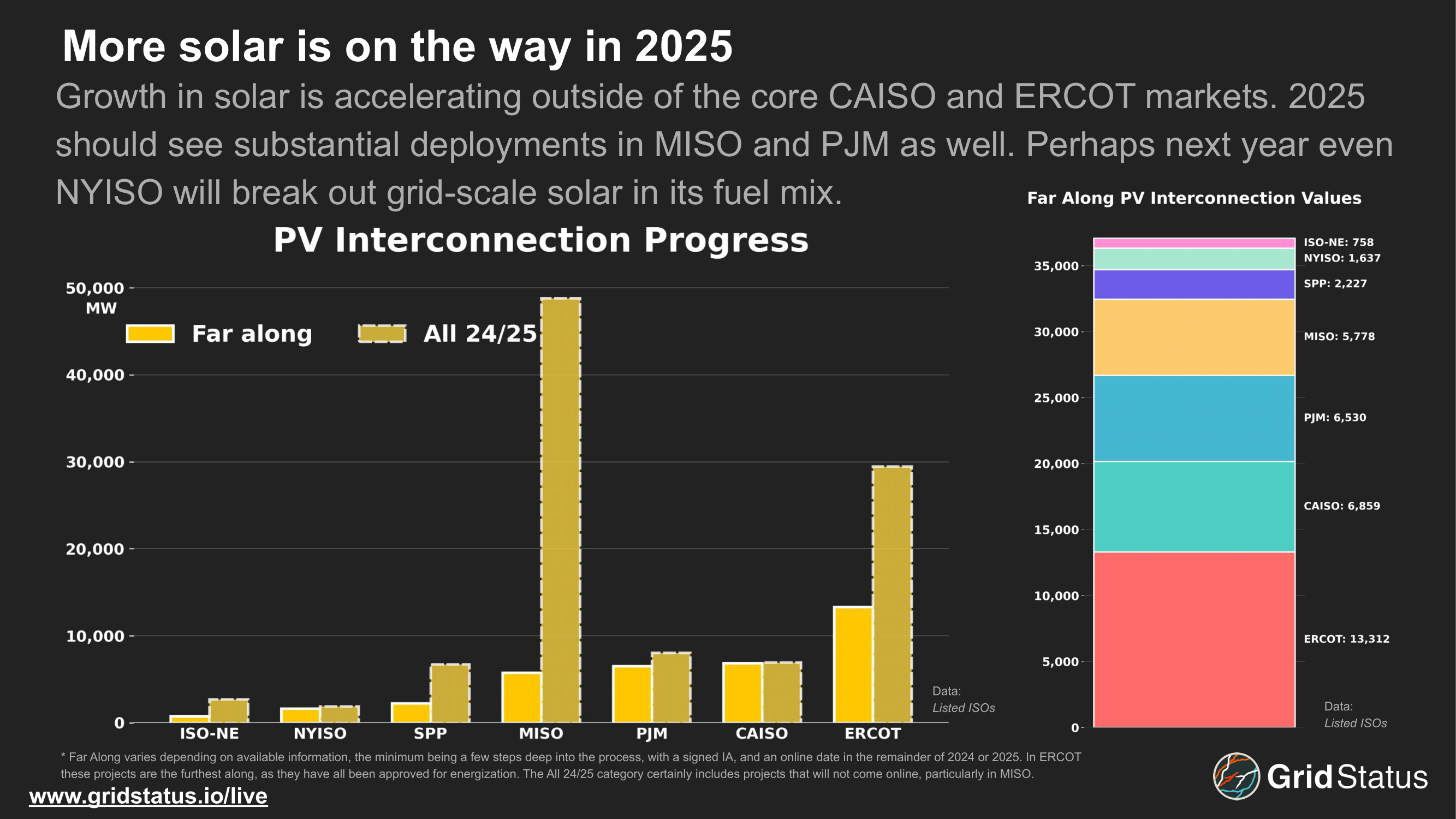 2024 isn't the end. Solar will continue to make inroads in CAISO and ERCOT while deployments grow in MISO and PJM. What actually comes online in 2025 is an open question. Never trust a COD until approval to energize has been reached (just check MISO's second bar for evidence of that), but the volume of projects is high enough that progress is likely to continue.