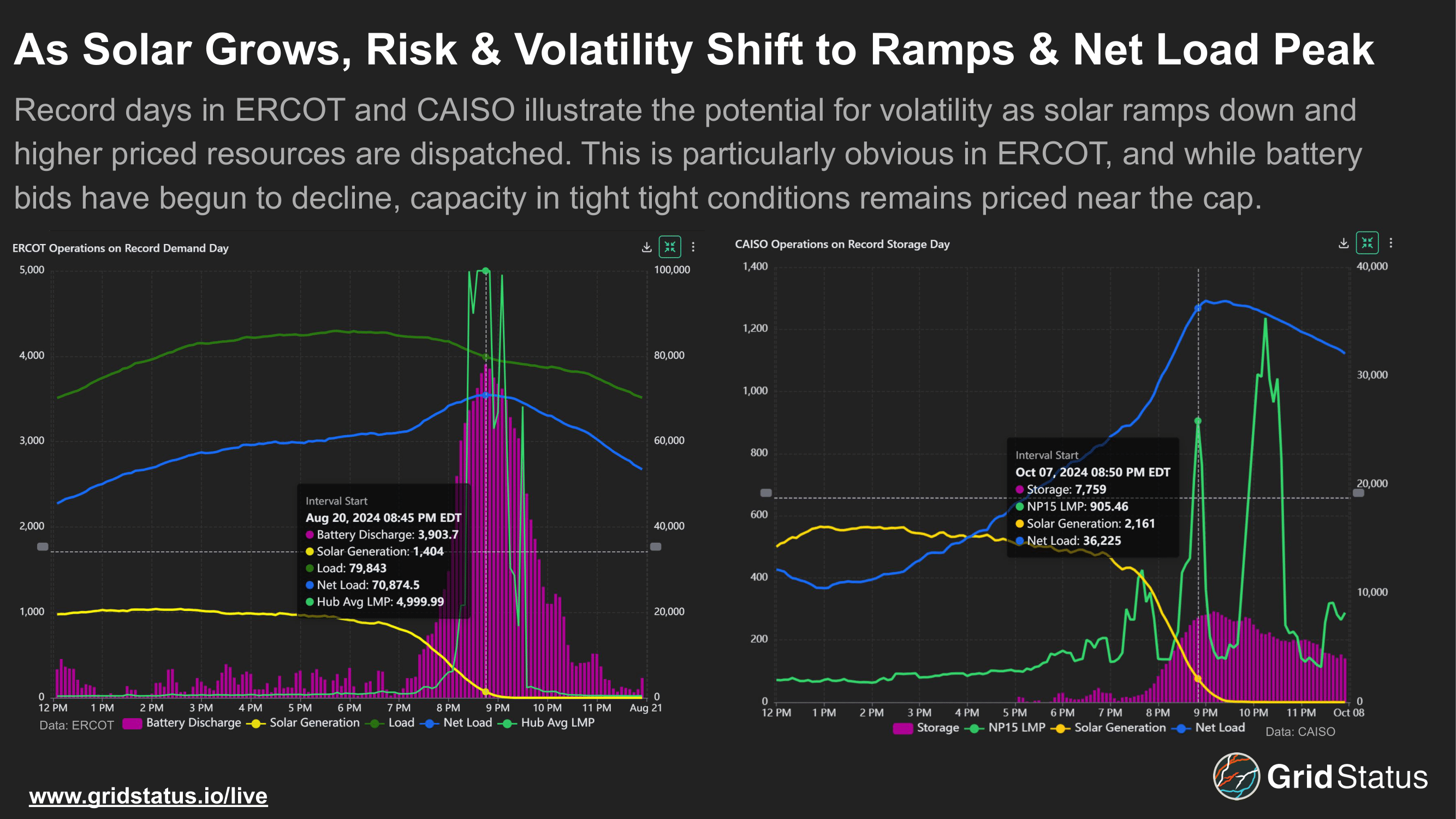 Large solar deployments create new risks and opportunities. Looking at a load record day in ERCOT and storage discharge record in CAISO, prices are much lower while solar is generating, but as it ramps down prices escalate along with net load.